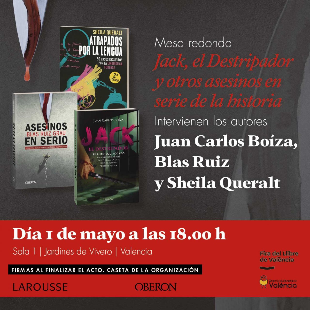Allí os hablaremos, no sólo sobre “Jack el destripador”, del que os presentaré mi último libro “Jack el destripador, el mito equivocado”, sino también sobre el fenómeno de los asesinos en serie a lo largo de la historia. Además, nos acompañarán: Blas Ruiz Grau, auténtico especialista en criminología y cuyas novelas y obras de investigación le convierten en uno de los mayores referentes en investigación criminal de este país; y Sheila Queralt, perita en lingüística forense y escritora que ha ayudado con sus análisis lingüísticos a resolver auténticos casos criminales y que es, sin duda, una de las mayores especialistas españolas.
